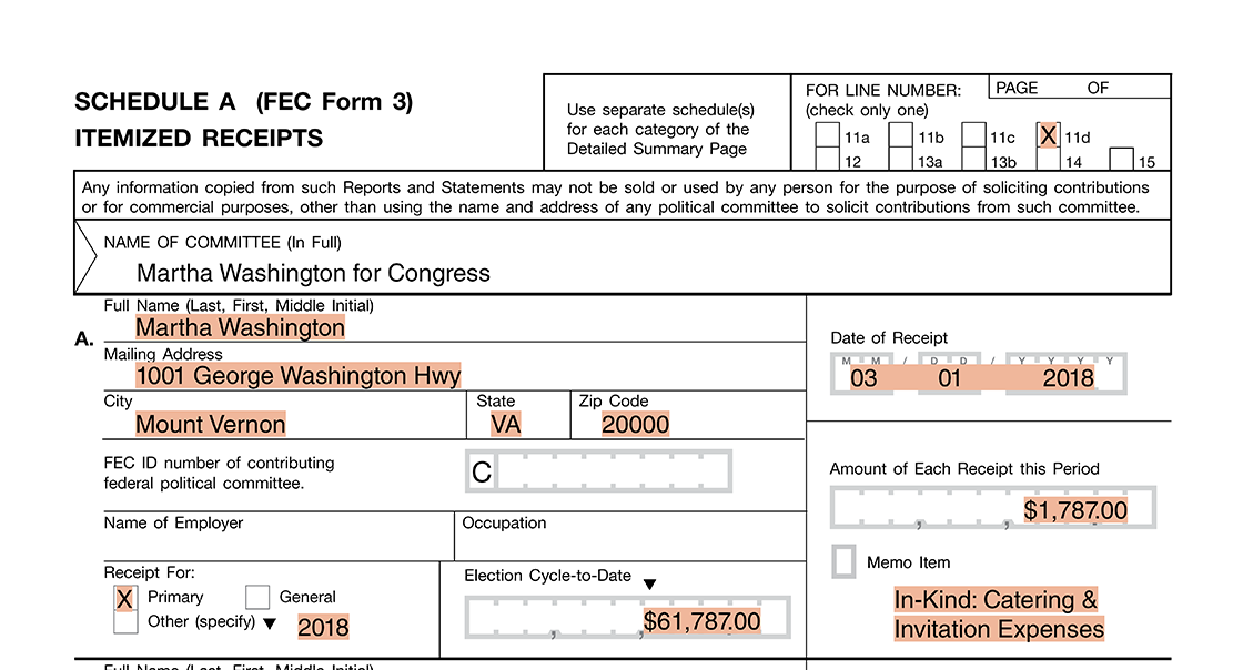 House and Senate committees report in-kind contributions on Form 3, Lines 11(d) and 17. When determining whether to itemize an in-kind contribution, treat it the same as a monetary contribution. An in-kind contribution from the candidate is itemized on Schedule A, supporting Line 11(d) when it: