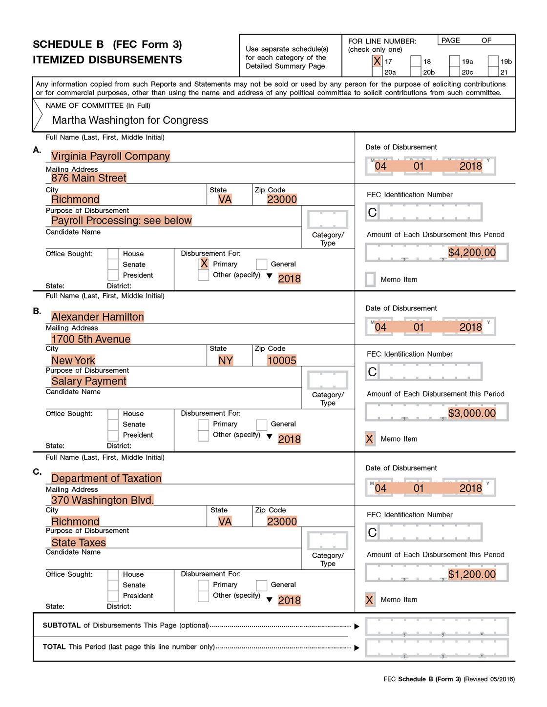 The committee will also itemize the ultimate recipients of the salary payments as memo entries on Schedule B, supporting Line 17, once aggregate payments made to the individual are more than $200 in an election cycle.