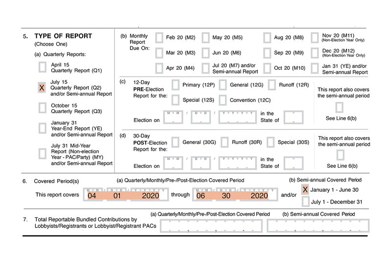 All reporting committees with bundled contributions to disclose must file a report covering the semi-annual periods of January 1 through June 30 and July 1 through December 31. Totals for the first six months of the year will appear on quarterly filers' July 15 report and on monthly filers’ July 20 report. All reporting committees must disclose totals for the second half of the year on their January 31 Year-End report. (In a non-election year, committees that file only semi-annually should file Form 3L on July 31 and January 31 of the next year.) A semi-annual report is required only if the committee exceeded the reporting threshold for bundled contributions during that specific semi-annual period. However, if the threshold has not been exceeded during that particular semi-annual period, a semi-annual report is not required.