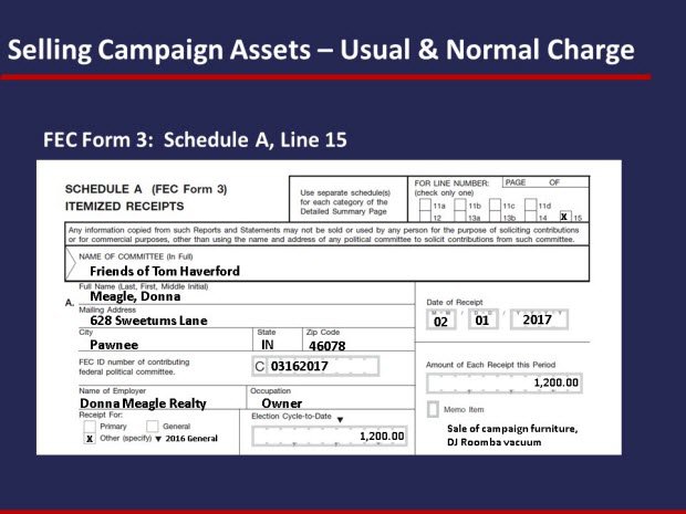 Example B: FEC Form 3, Schedule A, Line 15, Selling Campaign Assets - Usual and Normal Charge