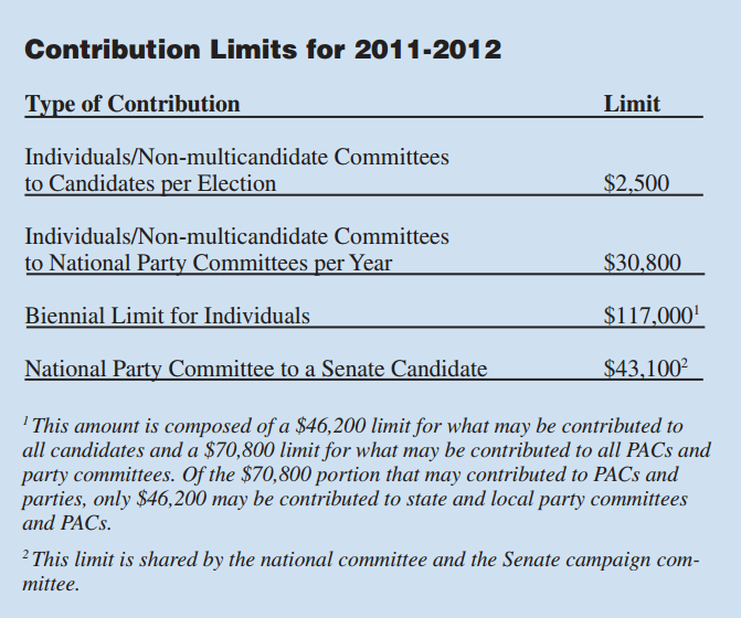 Please see the chart above for the contribution amount limits applicable for 2011-2012. The inflation adjustments to these limits are made only in odd-numbered years. The per-election limits on contributions to candidates are in effect for the two-year election cycle beginning the day after the general election and ending on the date of the next general election (i.e., November 3, 2010 – November 6, 2012). All other contribution limits are in effect for the two-calendar-year period beginning on January 1 of the odd-numbered year and ending on December 31 of the even-numbered year (i.e., January 1, 2011 – December 31, 2012).